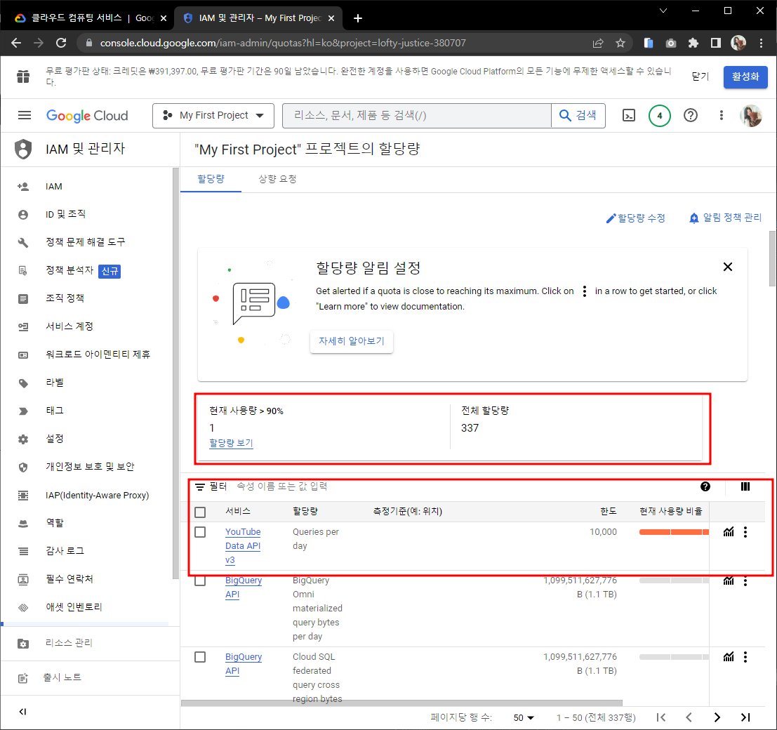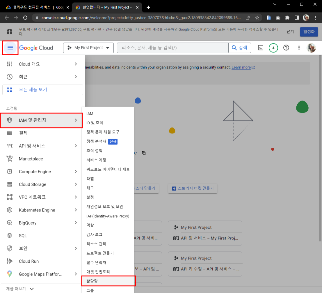 햄버거버튼 - IAM 및 관리자 - 할당량