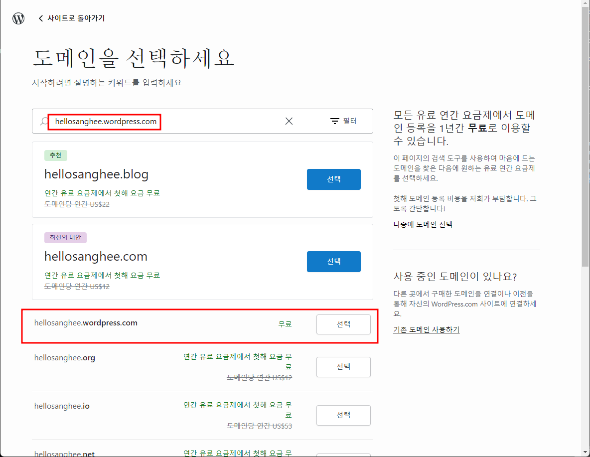원하는 도메인 검색 - 선택