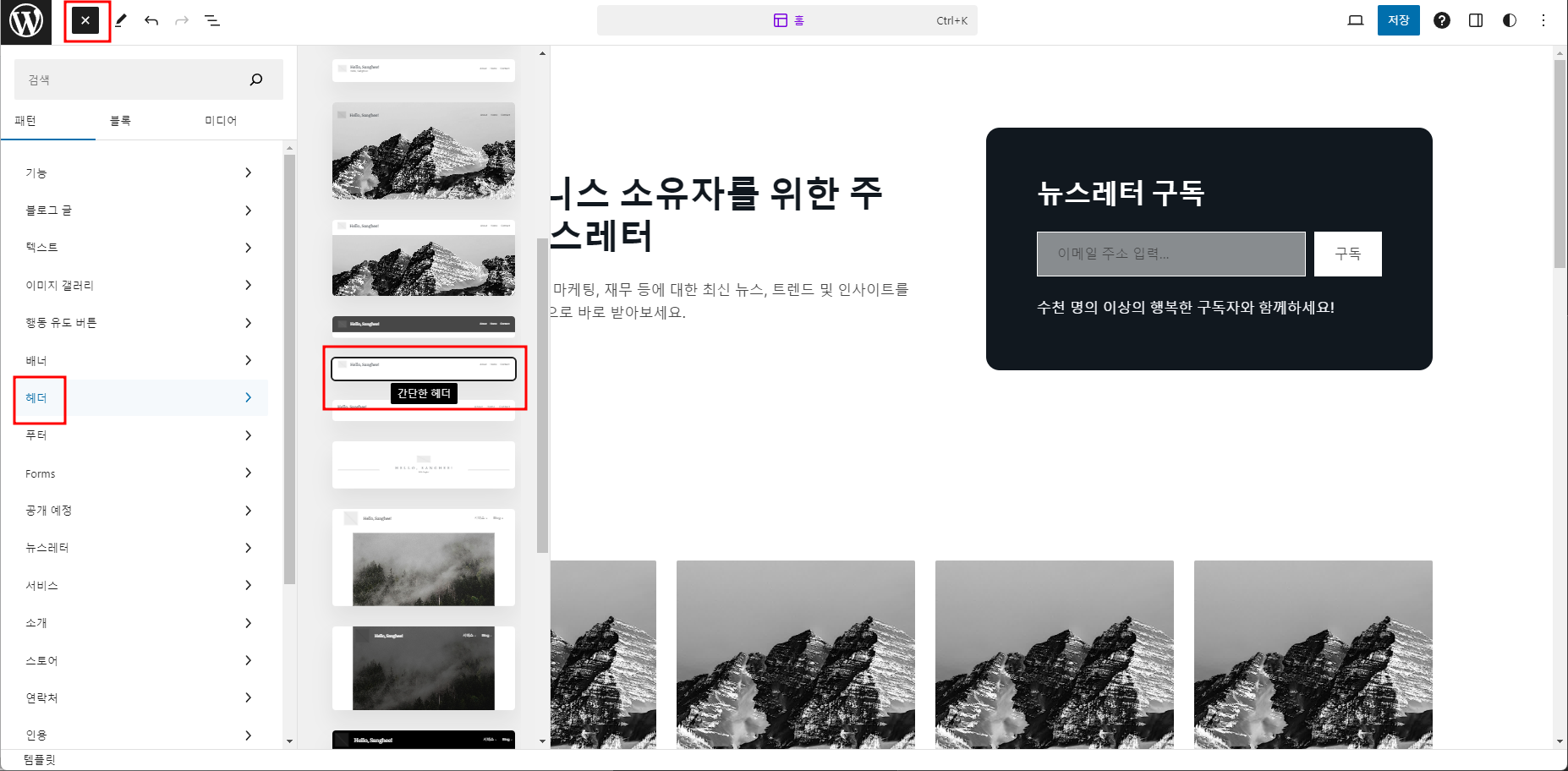 우선 원하는 디자인의 헤더를 추가하자.