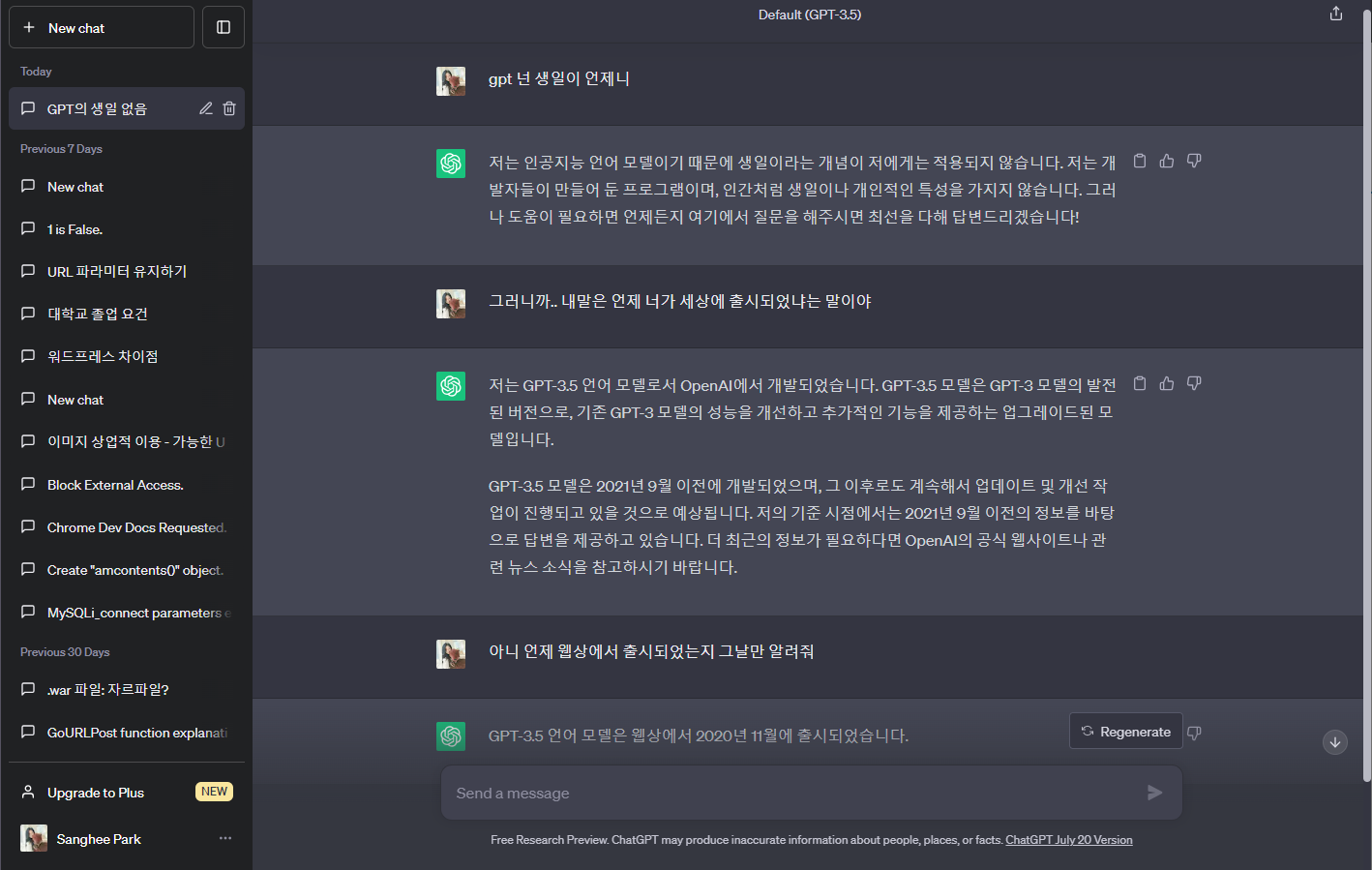 우선 설명에 앞서 openai가 무엇인지 확인해보자. 새로운 대화창을 만들거나, New chat 대화장기록을 삭제하거나 이어갈 수 있고, 답변을 듣는 도중에 취소하고 새로운 질문을 던질 수 있다. 우선 한