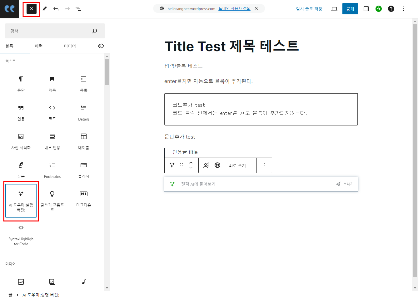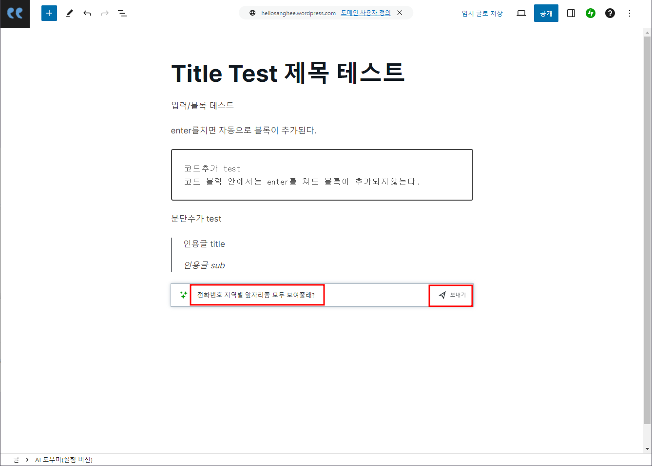 wordpress에서 글쓰기 창으로 넘어가는 방법은 쉽게 찾을 수 있다. 편한루트로 이용하자. 글을 쭉 쓰다가 필요한 형식이있다면 검색하거나 선택해서 이용한다. 이상태로 저장하면 본문에 있는 이