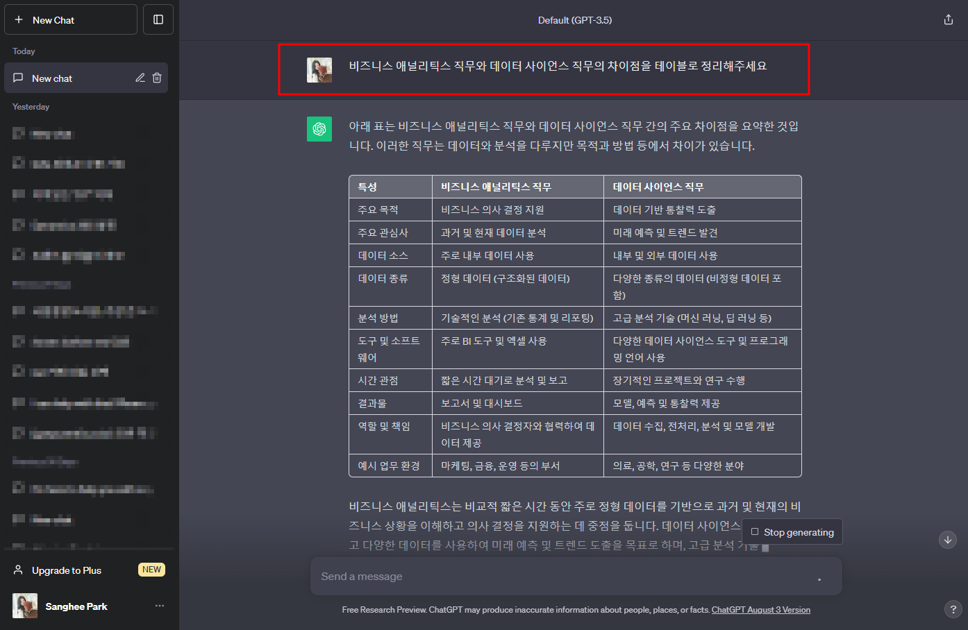 우선 설명에 앞서 openai가 무엇인지 확인해보자. 새로운 대화창을 만들거나, New chat 대화장기록을 삭제하거나 이어갈 수 있고, 답변을 듣는 도중에 취소하고 새로운 질문을 던질 수 있다. 우선 한